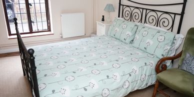 The large main bedroom is 2 steps down from the upper landing, it has ample hanging and drawer space, mirror, bedside tables with lights and for winter double sided thermostatic double under blankets. All linen is supplied as our towels - bath and hand. The room is double aspect - rear garden and front.