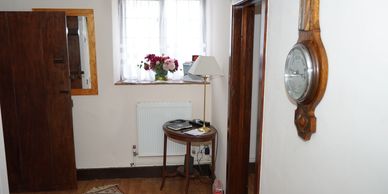 The ancient oak beamed lounge has the large inglenook housing the highly efficient wood burner in it has sofa and two comfy chairs – tables and wall mounted TV. Main cottage internet router - independent to main house. It is has a polished oak wood floor and double casement doors giving access to the rear patio.
